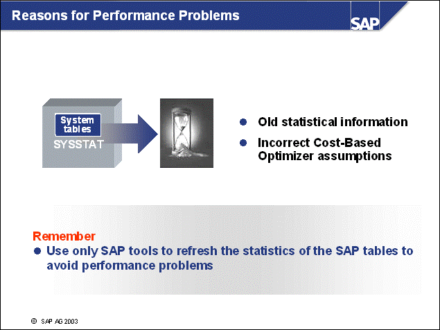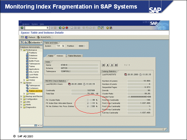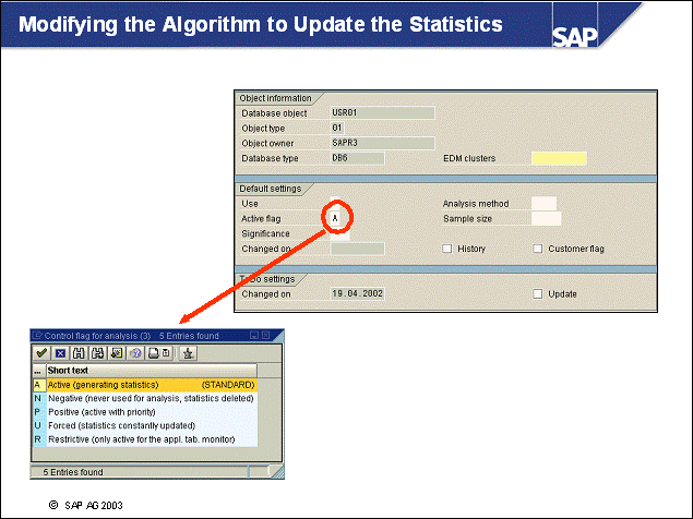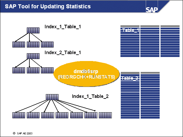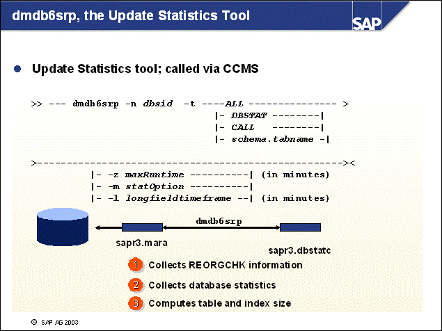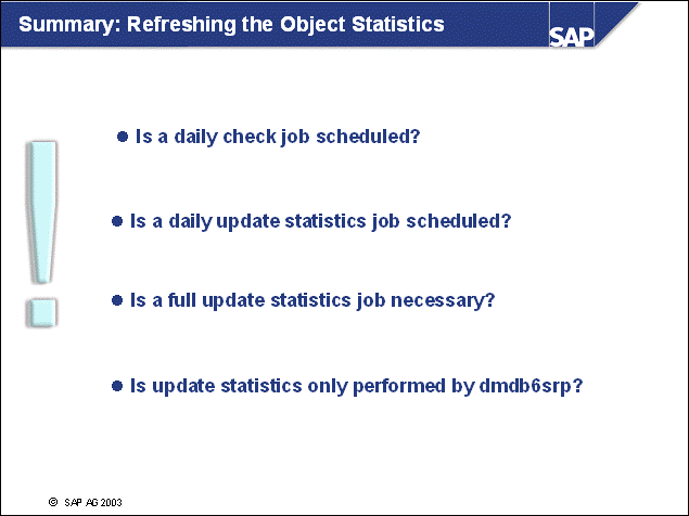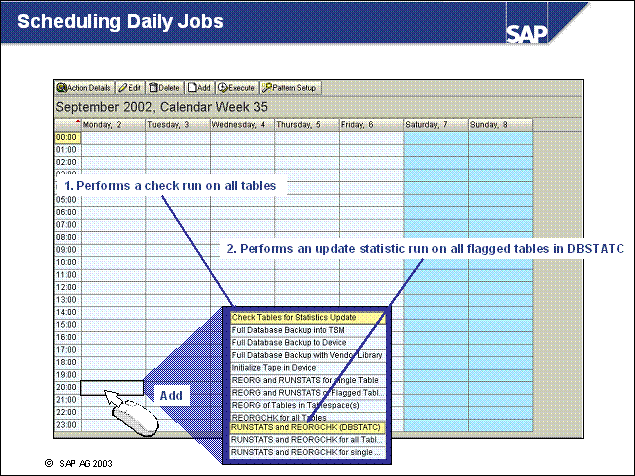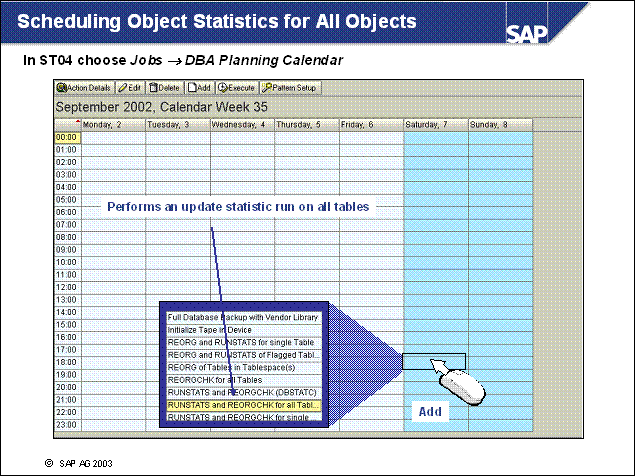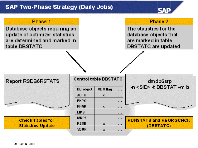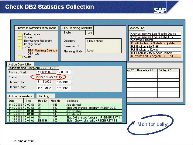 n To check the log of the 'Check Tables for Statistics Update' and 'Runstats and Reorgchk (DBSTATC)' actions, from transaction ST04, choose Jobs DBA Planning Calendar (transaction DB13).