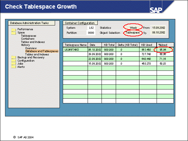 n First you should check the growth of the tablespace. To do this, call transaction ST04, choose Space -> History -> Database and Tablespaces.