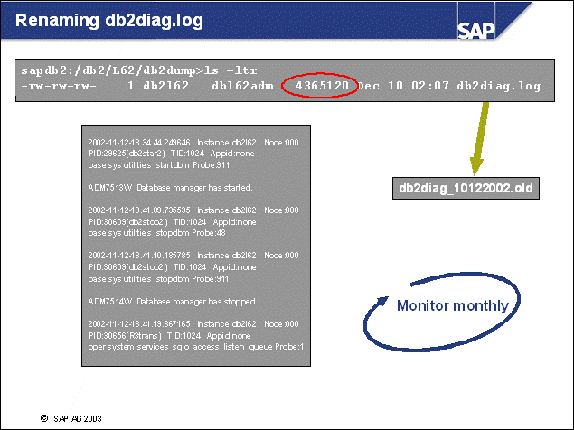 n The db2diag.log file will receive a lot of information. This file might grow very fast. To avoid long access times, it is useful to rename this file on a monthly basis.
