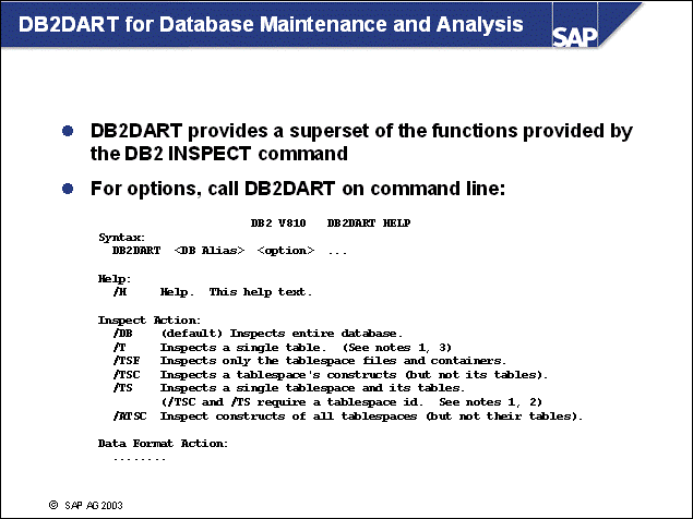n A subset of the DB2DART functionality is available with the DB2 command INSPECT, which can be called during normal operations.