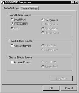The installation process installs a AGOGO/Maestro Applet Icon in the System Control Panel. The AGOGO applet displays and sets the AGOGO's various settings. If the AGOGO-XP PCI Audio Adapter contains local RAM, The software driver select local RAM for the Sound Library Source the first time it boots up. If the adapter card does not contain local RAM, system RAM will be selected. You may switch between system and local RAM setting in the AGOGO/Maestro applet.