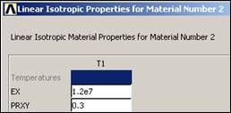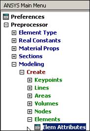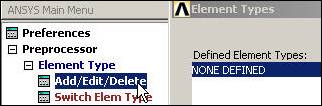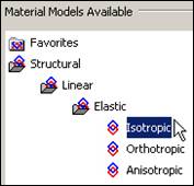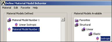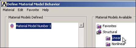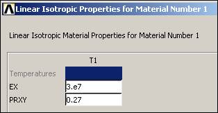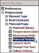 Here you will use the simplest linear, isotropic, 1D material description. ANSYS has full anisotropic (completely directionally dependent), as well as non-linear material "constitutive laws". Activate the material properties with: