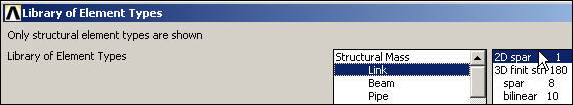 Since the problem class is that of a truss you will need a 2D structural line element, or link, that transmits only axial loads. Open and add to element types you need: