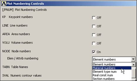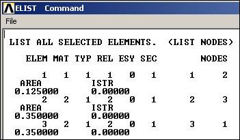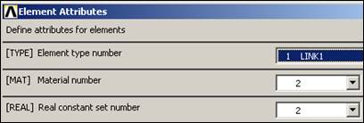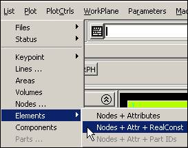 Next you have to associate each of the elements with your previous material numbers and real constant sets. Plan ahead and input those of the same type in sequence: