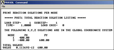 Notice that the vertical reaction force of 600 (lb) is equal and opposite to the sum of the applied loads. Likewise, there were no horizontal forces applied, so the top (400 lb) and bottom (-400 lb) wall reactions yield a null horizontal force. They also form a couple (of 400 lb * 15 in = +6,000 in-lb) that is equal and opposite to the moments of the applied forces (of 0 - 300 lb * 20 in = -6,000 in-lb), relative to node 1.