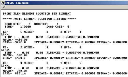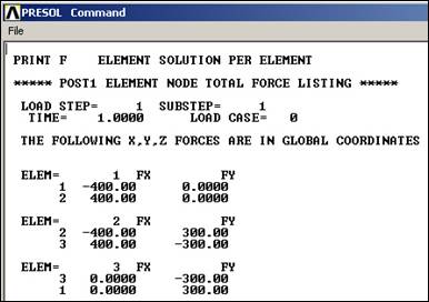 The element (member) forces in the truss resulting from the computed displacements can also be recovered and listed (along with entities such as elastic and thermal strains that are not considered here) with: