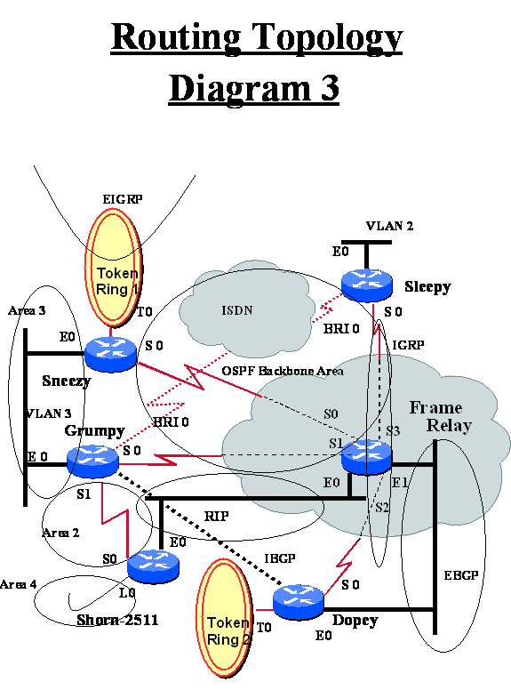 Configure OSPF on Grumpy, Sneezy, Shorn, and Sleepy. Refer to Diagram 3 for area designations.