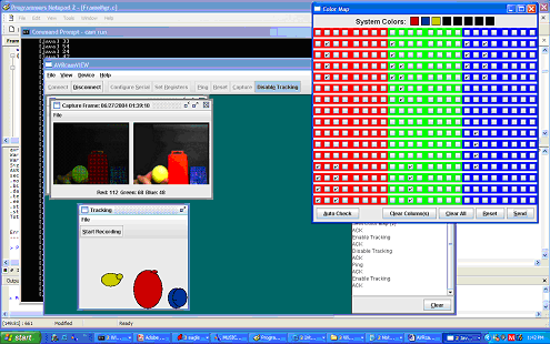A PC-based application (AVRcamVIEW) was also developed to provide a platform for evaluating, testing, and configuring the AVRcam. This application interfaces to the AVRcam through the standard RS232 port on any PC. This application allows the user to take snapshots with the AVRcam, and view them or save them for later use. Once a snapshot is taken, the user can quickly set up the color map to be used by the AVRcam, by simply clicking on the colors of interest. AVRcamVIEW will automatically build and download a color map to the AVRcam for to be used during object tracking. Finally, AVRcamVIEW can display the real-time tracking results to the user. An example screenshot is shown in Photo 2.