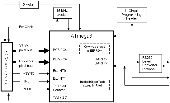 The goal of the AVRcam vision engine was to provide a small, low-power system capable of tracking multiple colorful objects in real-time. Minimally, such a system would need to consist of an image sensor that would be responsible for converting images into a useable format for processing, a computing entity, and a user-interface.