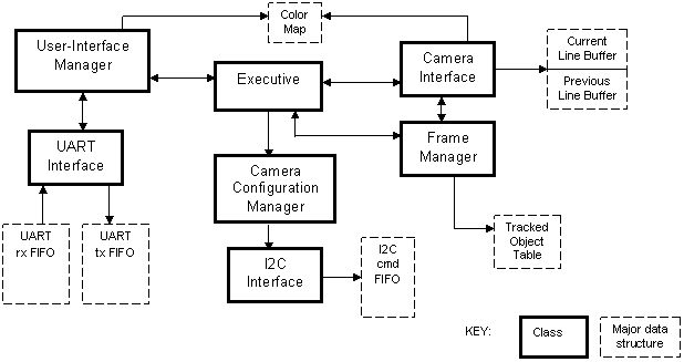 Once a complete frame of data is acquired, the contents of the TrackedObjectTable are written to the transmit FIFO of the User-Interface Manager. Then, the system goes to sleep, waiting for the next frame to begin. The data in the User-Interface Manager transmit FIFO is sent out one byte at a time after each line has been acquired. Assuming it takes ~86 uS to transmit a byte of data at 115.2 Kbps, this one-byte-at-a-time transmission will be simultaneous with the acquisition of each line of pixel data in the next frame.
