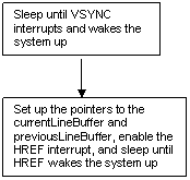 As shown in the hardware block diagram, pixel data is sampled through the lower nibbles of PORTC and PORTB of the ATmega8. With the VSYNC line hooked up to External Interrupt 0, the ATmega8 knows exactly when a frame of data has started. Once the data has started, the rising edge of HREF (which is hooked up to External Interrupt1) will indicate when each line begins. Since the PCLK is connected to Timer1 (configured as a 16-bit counter with interrupt on overflow), it is possible to pre-load the counter to overflow after 176 pixels have been sampled, thus indicating that the line has been acquired. At no time is it necessary to actually check the state of the PCLK line, since we synchronize with it at the beginning of each line through the HREF signal.