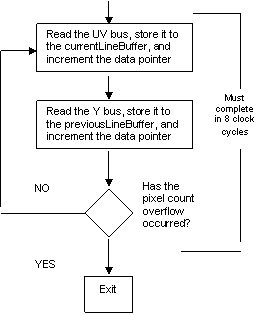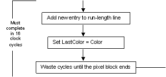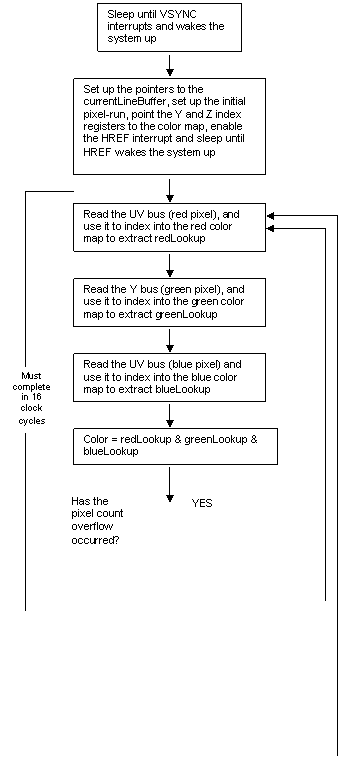 When the system is in tracking mode, only half the pixels in each line are sampled, for a total of 88 pixels per line. The time between "pixel blocks" (defined as an R-G-B triplet) is eight clock cycles. Skipping every other pixel block allows for sixteen clock cycles to sample the pixel block, map the R-G-B triplet to an actual color (based on an algorithm developed at Carnegie Mellon University [4]), and run-length encode the line of data. This process is shown in Flowchart 2.