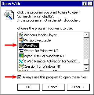 First, let's create a new menu in the Main menu of Unigraphics. Open the file UGS180\UGII\menus\ug_main.men. In the Windows® environment, right-click over the file and select Open With | Choose Program from the pop-up menu to display the Open With dialog. Scroll through the list and select a program to view this text file. WordPad is a good one since it doesn't change the file extension when you save a text file. Activating the option at the bottom of the dialog assigns files with the .men extension to WordPad. Then the next time you open a menu file, you only have to double-click it. |