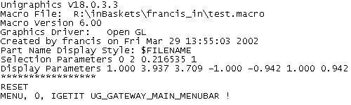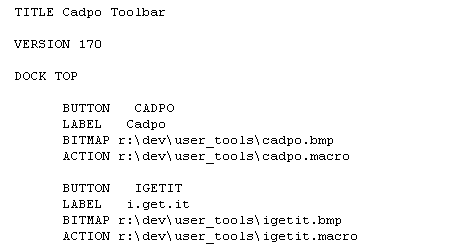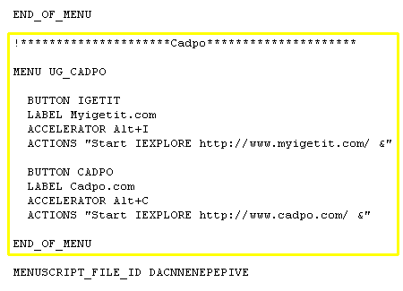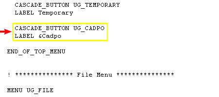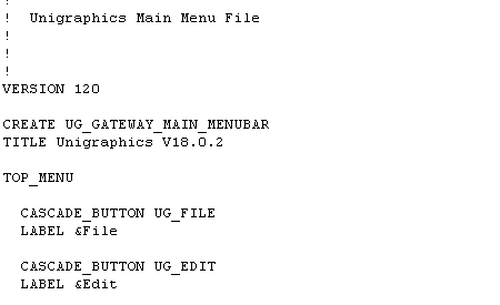 This section contains the menus along the top bar in Unigraphics - File, Edit, etc. These menus are in the order they display in UG. Scroll down a few lines until you see "END_OF_TOP_MENU." Just before this line, add two lines to create a new menu. This involves the commands CASCADE_BUTTON and LABEL that reference unique names. The latter reference is how the menu displays in Unigraphics. |