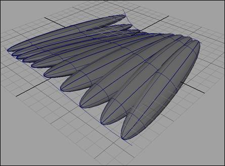 Here is what the nurbs surfaces that will be deforming the mesh look like, as well as the upstream nodes that are created and connected after the deformer has been created: