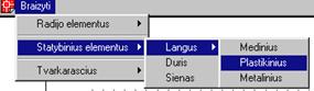 Virsutinio meniu skyriaus, aktyvinančio grafinį meniu ir iskviečiančio trimačių objektų braizymo komandas, fragmentas |
