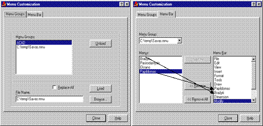 Vartotojo meniu skyrius į darbinį meniu įkelti galima modifikuojant darbinio meniu failo, pvz., ACAD.MNU, tekstą arba meniu komanda MENULOAD (Tools Customize Menus.). Zemiau pateiktas scenarijus, kaip vartotojo meniu (C:\Temp\SAVAS.MNU) skyrius Braizyti ir Papildomas įkelti pries AutoCAD meniu (ACAD.MNU) skyrių Dimension.