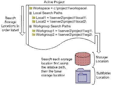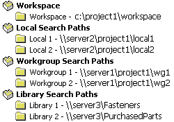When Autodesk Inventor needs to find a file, it searches for it using the Active Project. The project defines options that control Autodesk Inventor file management functionality and may contain storage locations defining where Autodesk Inventor should search for files. With the exception of Libraries, Autodesk Inventor searches storage locations in the order they are defined within the project file. A project file can define two fundamentally different types of storage locations: Editable Project Locations and Libraries. The editable project locations are further subdivided into three categories: Workspace, Local Search Paths, and Workgroup Search Paths. When the different types of storage locations should be used is discussed later in this document.