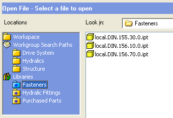 The Autodesk Inventor Save and Open dialog boxes make it easy for the user to select files located within the active project. The Locations explorer of the dialog box lists the Workspace, Search Path, and Library locations defined by the Active Project. |