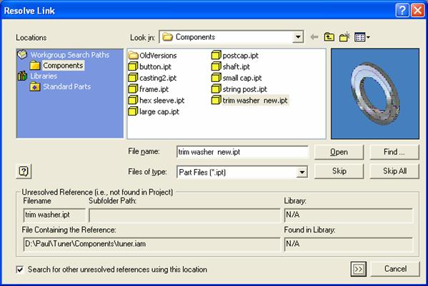 When Autodesk Inventor cannot find a file using the active project, it presents the Resolve Link dialog box. The resolve link dialog allows the user to specify the current location of the file being referenced within the Active Project. Once Autodesk Inventor can find the file, it writes new information into the file containing the reference the next time it is saved. As a result, the file will be found the next time the referencing file is opened.