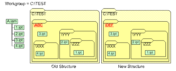 When a part is placed into an assembly, Autodesk Inventor performs a process called "back resolution." At the time the part is placed into the assembly, Autodesk Inventor knows exactly where it is located even though this "absolute path" is not stored in the assembly. Using back resolution, Autodesk Inventor finds the corresponding storage location, and determines the "subfolder location" relative to the storage location. |