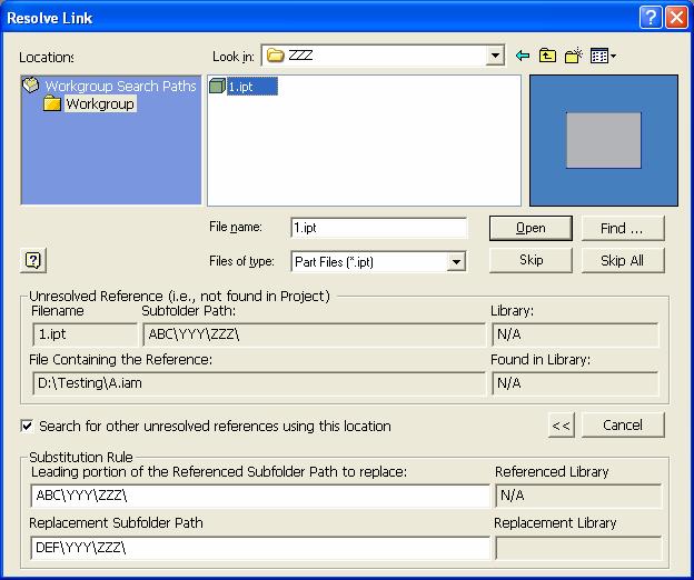 Obviously, it would be a tedious process to have to specify the location of each file that could not be found when they all can't be found for the same reason. To address this problem, Autodesk Inventor provides what is called a "substitution rule." When you browse to a new location, Autodesk Inventor automatically creates a simple substitution rule that allows it to find other files that could not be found for exactly the same reason.