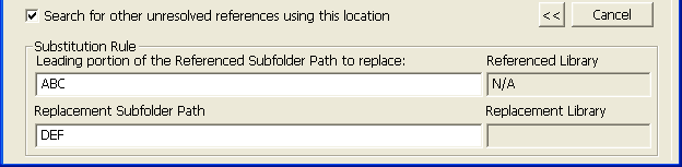 Using the More button (>>) on the Resolve Link dialog box, you can see the substitution rule that Autodesk Inventor automatically creates. Depending on the situation, you may be able to edit the substitution rule (usually by deleting some tail portion of the paths) to further reduce the number of times Autodesk Inventor asks where to find a file. Take the following example where the user desires to change the name of folder ABC to DEF.