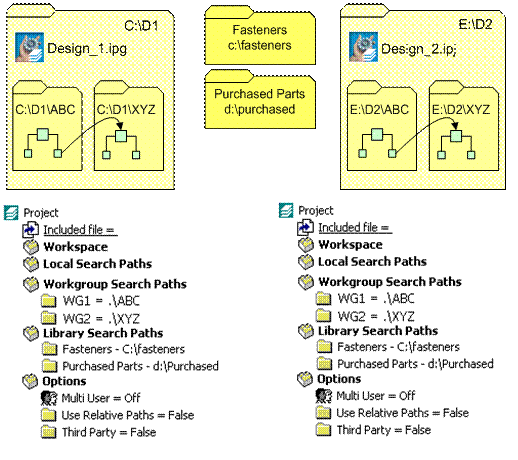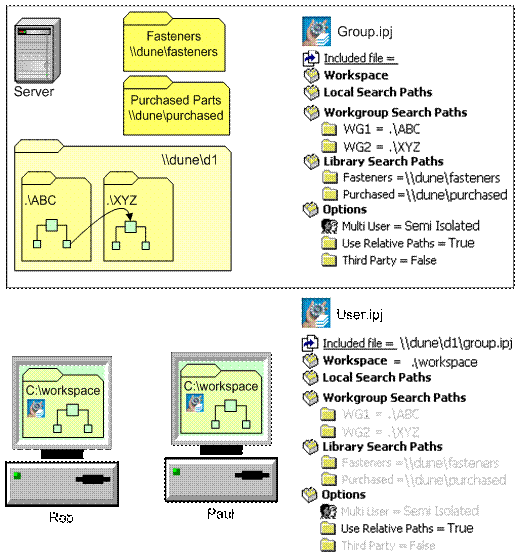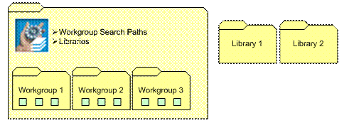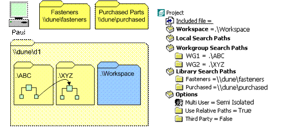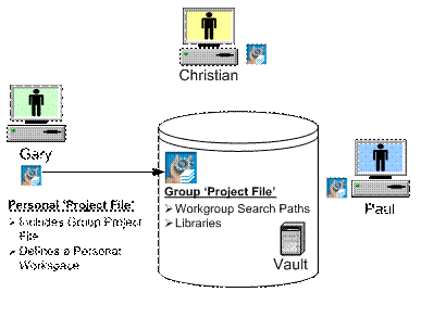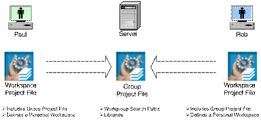 A common Project file defines Workgroup Search Paths and Libraries. Each user has a personal project that includes the group project file, but also defines a personal workspace. |