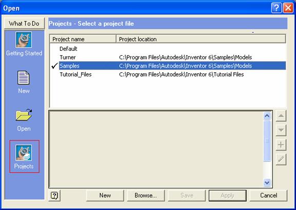 When Autodesk Inventor is first installed, it contains three projects. The first is the Default project, which allows a user to create simple assemblies of parts with no setup required. The second project is Samples, and allows easy access to all the sample files delivered with Autodesk Inventor. Lastly, the Tutorials project is used to teach the basic design workflows of Autodesk Inventor.