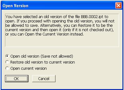 Autodesk Inventor creates versions for two reasons. First, it is an essential component to the functioning of Autodesk Inventors Multi-User environment. Second, it provides the ability for a user to retrieve a previous copy of a file. It is very important to note that Autodesk Inventor provides versions on a per file basis. As a result, a user can restore an old version of an assembly file, but there is no automated way to restore the state of an assembly including the edits to all the various parts.
