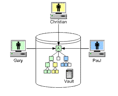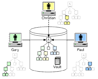 There is a server, which is the central file repository. Located on the server is a Group Project File that defines all file storage locations defining the repository. Each user has a personal workstation. Located on each workstation is a Workspace Project File that "includes" the Group Project File and defines a local Workspace. All files that are checked out from the server are located in the Workspace (usually on the user's personal workstation). The contents of a user's workspace are not visible to the other users or from the Group Project file.