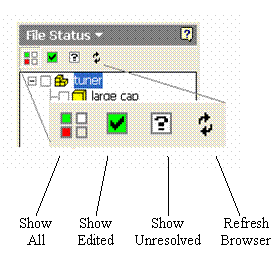 To the left of each project based item in the browser is a status box. (The status box is missing if the file is in a library or outside the project altogether.) The status box can have the following values: