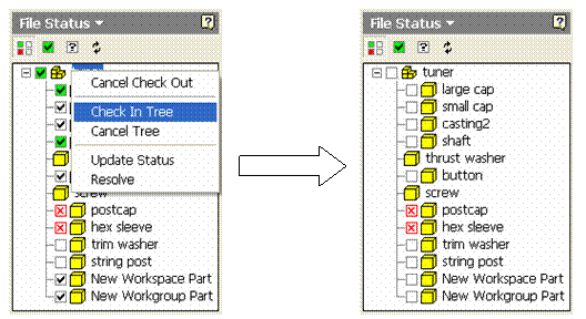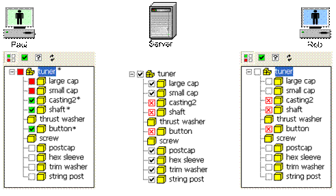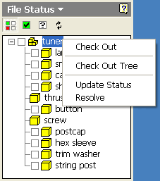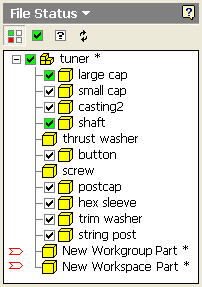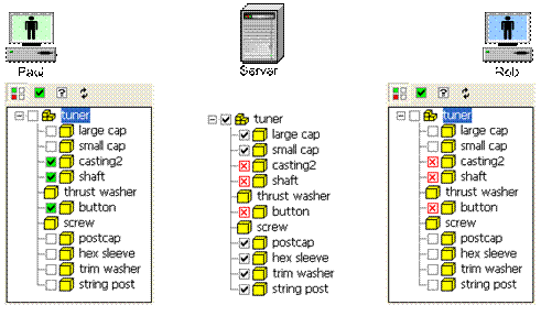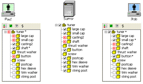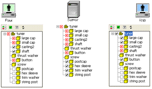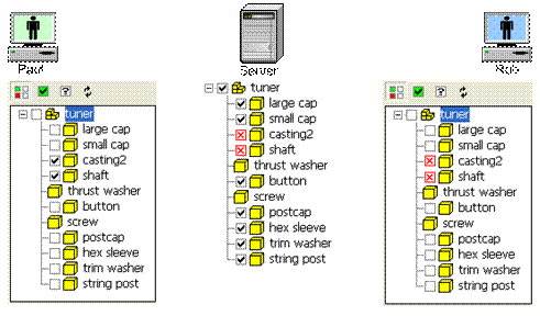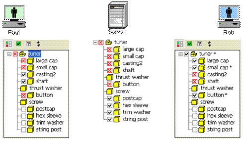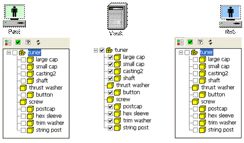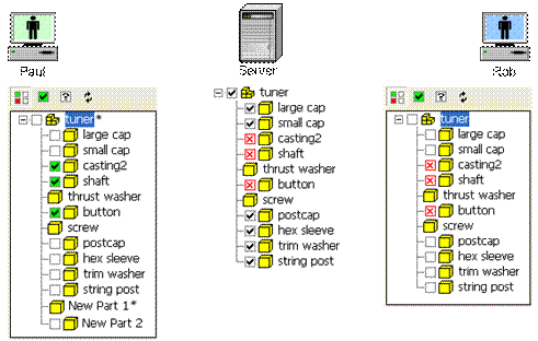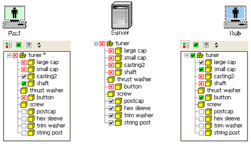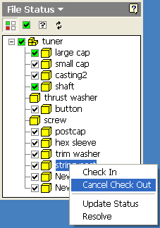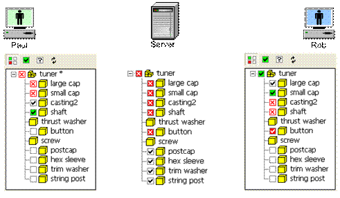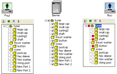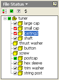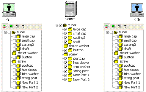 Paul checks out the casting2 and shaft parts. If Rob already opened the tuner assembly, he does automatically see that Paul checked out some parts. To see the updated status, Rob uses the Refresh command on the File Status browser toolbar. Note: If Rob tried to check out either part, he would see that the parts are already checked out by another user.