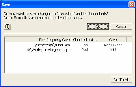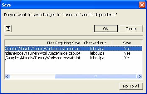 When the Save command is invoked the Autodesk Inventor Save dialog box is presented. The dialog box lists each file that was edited either explicitly by the user or indirectly by Autodesk Inventor. For each file in the list a Checked Out status is displayed along with a Save option. By default, Autodesk Inventor assumes that you want to save all files that are checked out and were edited. If you don't want to edit one of the files, click Yes and it changes to No. If a file is not checked out but available, you can click on No and it changes to Check Out/Yes.
