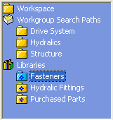 In this example, the project file has three library locations, one of which is called Fasteners. The Fastener library is selected. The blue folder indicates that Autodesk Inventor recognizes the Fastener library as the storage location. |