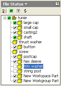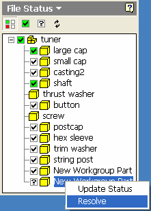 Notice that Rob's File Status browser does not show the new parts. Why? Autodesk Inventor checks the status of each open file. The tuner assembly that is currently open does not know about the new parts. The new parts show up when the assembly is refreshed to see the latest version of the tuner assembly.