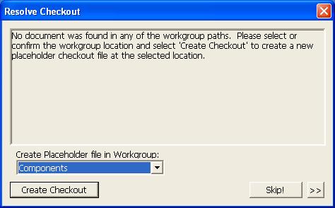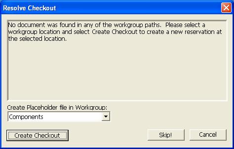 When the Resolve command is used on a file of unknown status, the following dialog box is presented. The Resolve Check Out dialog box allows the user to specify which Workgroup is used to store the new file by selecting one of the Projects Workgroups from the drop-down list. After choosing the desired Workgroup, you can use the Create Check Out command to reserve a location on the server for the new part and ensure that another user does not take the filename.