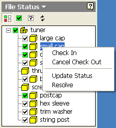 Paul is done editing and is ready for Rob to see his changes and new parts. Paul uses the Check In Tree command to Check In tuner and all its children that have been checked out. Rob uses the File Status browser's Update Status command to see the changes.