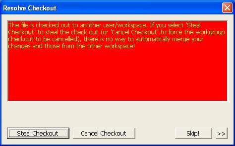 In these situations, you can use the Resolve command on any file that has a Check Out pending. When issued, the following dialog box is displayed and provides options to either Steal Check Out or Cancel Check Out.