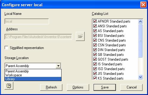 The Autodesk Inventor Content Library allows the user to specify where generated files that represent standard content should be stored. The storage location is defined by selecting the Configure button on the Content Library browser. |