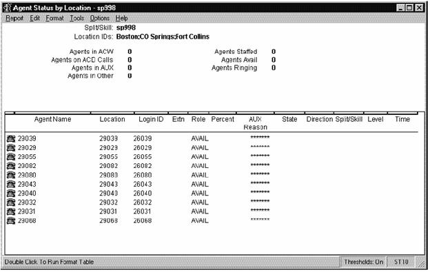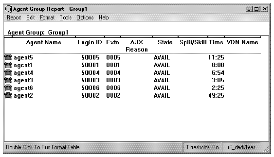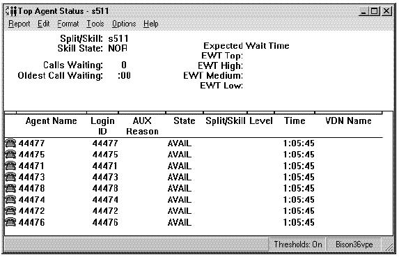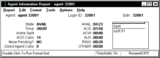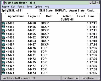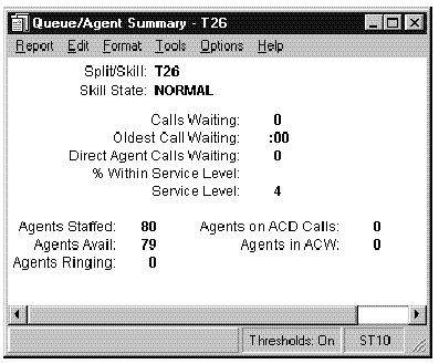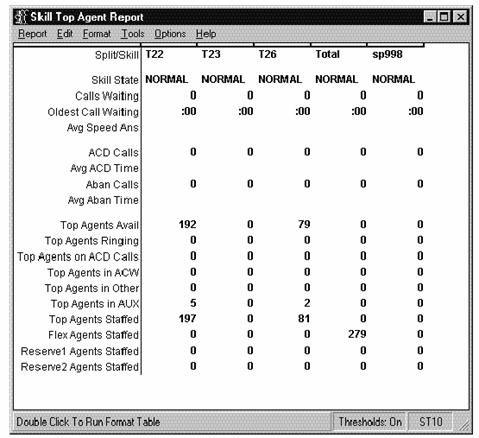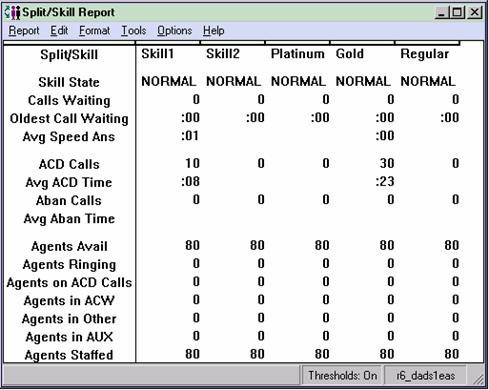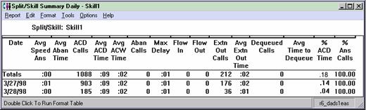 This report shows the status of agents in the split/skill and cumulative split/skill statistics. Call center managers can use this report for large numbers of agents in one split or skill, and need split/skill status but do not want to consume the PC resources required to display individual agent status of many agents. Call center managers can use this report to see the totals and averages for a specific split or skill up to a certain point in the day.