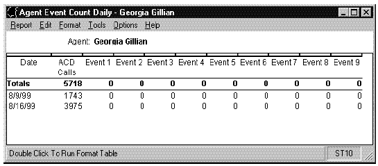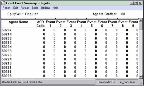 The Agent Event Count report shows the total number of times that an individual agent pressed an Event Count (sometimes referred to as Stroke Count) key for all splits/skills. An Event Count key can represent any call event, including a successful sale, a call from a demographic category, or a response to a promotion. Avaya CMS records an event occurrence each time that an agent presses an Event Count key on his or her voice terminal while the agent is on an ACD call or in call-related ACW. The Event Count report is available in interval, daily, weekly, and monthly versions.
