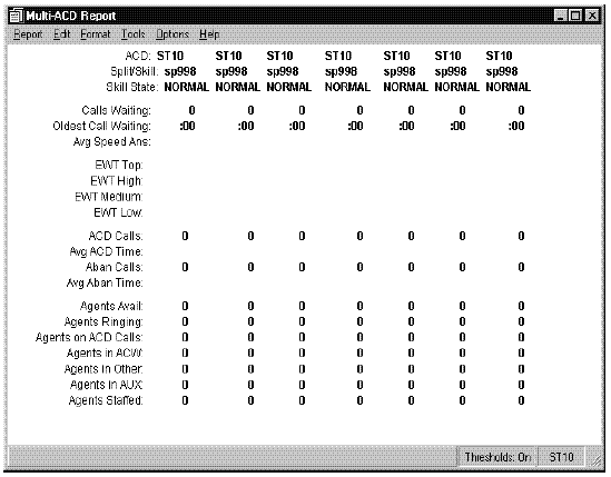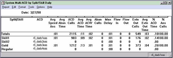 You can specify a list of splits/skills available for each ACD desired. The System Multi-ACD Report by Split/Skill report is available in daily, weekly, and monthly versions. Standard Multi-ACD reports can include information on up to eight ACDs.