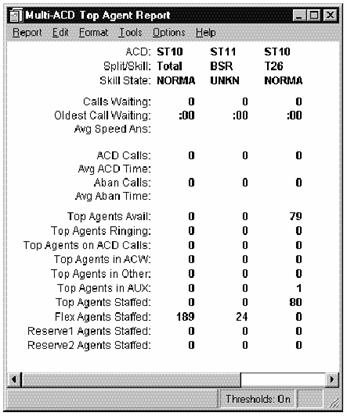 The bottom right of the report contains a status bar that displays the name of the ACD chosen through the Report Selector dialog box. A legend on the right side of the report shows the names of the selected splits/skills.