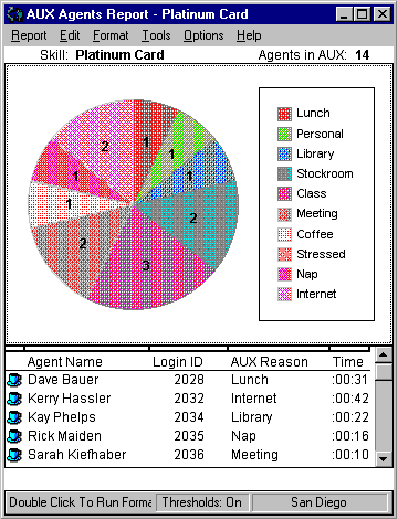 This report displays a three-dimensional pie chart that shows the reason codes for the time that the agents spent in AUX work mode. The percentage of AUX time (in hours and minutes) agents spent in AUX for each reason code is displayed inside the slice of the pie chart. A legend to the right of the pie chart shows a different color for each of the reason codes. This legend contains the dictionary-defined reason codes or numbers (if the reason codes have not been defined in Dictionary).