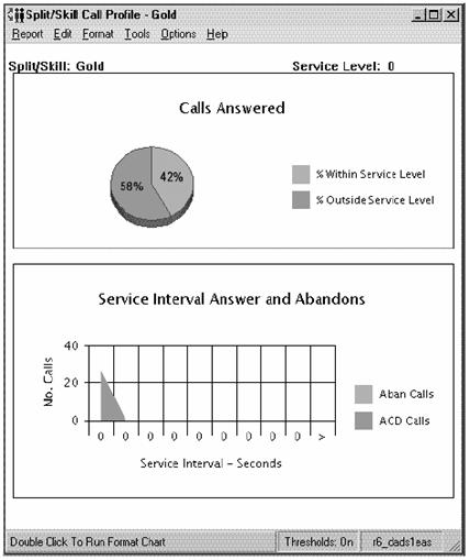 The three-dimensional pie chart in the upper-left quadrant shows the percentage of ACD calls answered within the predefined Acceptable Service Level and the percentage of ACD calls answered outside this level. The numerical value represented by each pie piece is shown inside the pie chart.