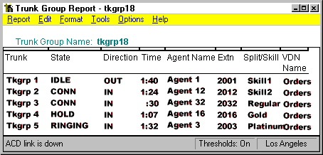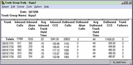 The Trunk Group Summary report shows the level of incoming and outgoing call traffic for an individual trunk group. You could use this report to verify that the number of trunks available to your splits is appropriate and to monitor the number of outgoing calls. The Trunk Group Summary report is available in interval, daily, weekly, and monthly versions. For both inbound and outbound calls, Call Carried = Calls Answered + Calls Abandoned + Other Calls. Also, Other Calls = Calls Given a Busy Signal + Calls Disconnected by the Switch + Calls Answered by an Unmeasured Agent. The report item Centum Call Seconds (CCS) is the number of 100-second increments in which the trunk was busy during the intrahour interval. A trunk is "seized'' while the call is both in queue and connected to an agent. Therefore, wait time for abandoned calls is figured into the CCS figures. For example, since a half-hour has 1800 seconds, the maximum CCS for each trunk in a trunk group is 18 CCS. Multiplying 18 CCS by the number of trunks in a trunk group gives you the maximum occupancy for the trunk group, which you can then compare with your actual CCS. If your intrahour interval is 15 or 60 minutes, your number will be different. The report item % Time All Trunks Busy, which is a good indicator of how many callers being blocked (getting a busy signal), should be a relatively low figure in most call centers.