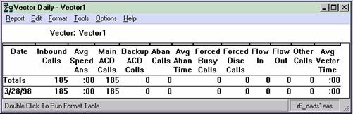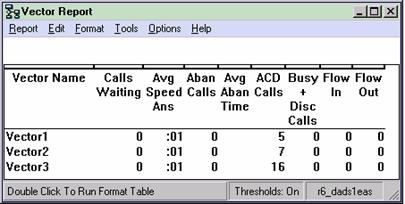 The Vector report displays, for a single vector, various types of data that show how calls were handled by the vector. This menu item is available only if you have purchased the Avaya CMS Vectoring feature and that feature has been authorized for you to use. The Vector report is available in interval, daily, weekly, and monthly versions.