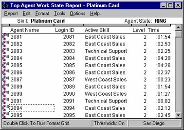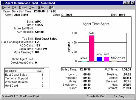 Supervisors can use this report to access further information on one particular agent without having to execute several steps and several different reports to get the pertinent information. This report enables supervisors to quickly evaluate agent performance and decide whether an agent should be added to or removed from a skill.