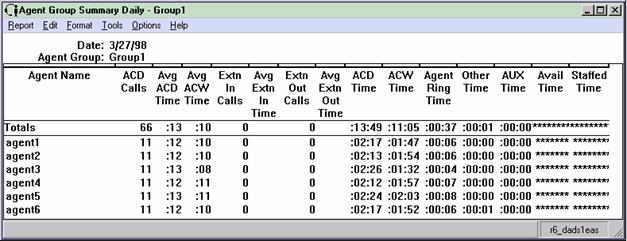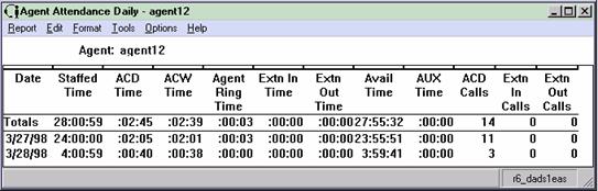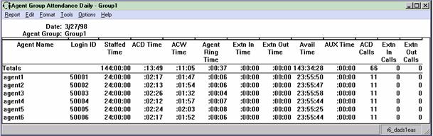 The Agent Group Attendance report summarizes staffed time, ACD time, ACW time, AUX time, time in the ringing state, extension time, available time, and number of calls handled for each agent in an agent group for the specified time period. The Agent Group Attendance report is available in daily, weekly, and monthly versions. The Totals column in the report(s) displays the totals for all agents in the group you have selected. Individual agent entries in this report show the totals for a particular agent.